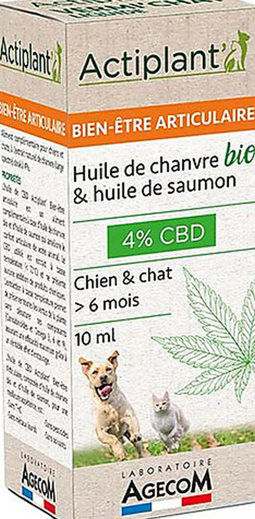 L’huile de CBD Actiplant’ Bien-être Articulaire, composée d’huile de chanvre bio et d’huile de saumon, pour une meilleure appétence, est sans THC, sans métaux lourds, sans pesticides, sans solvants.