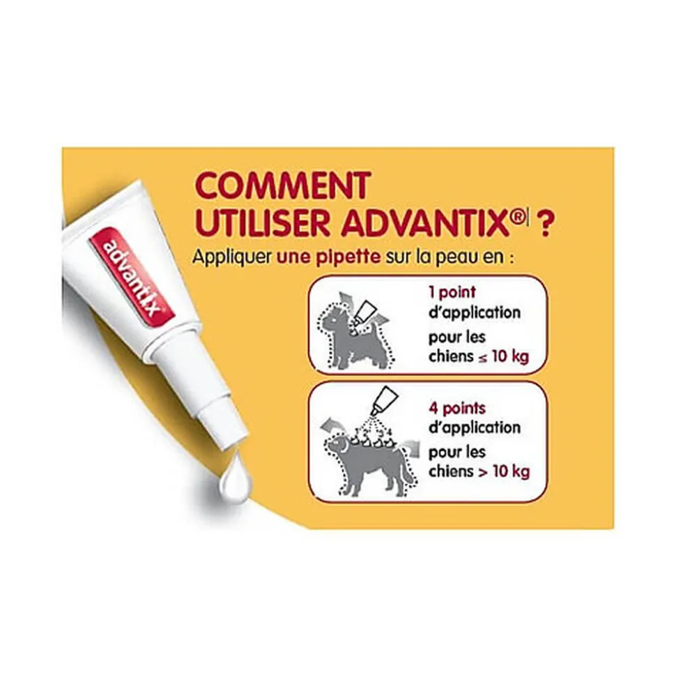 | Mentions légales | ADVANTIX GRAND CHIEN – Solution pour spot-on. Espèce de destination : Chien. Indications : puces, tiques, poux broyeurs, moustiques, phlébotomes, mouches d’étable. Contre-indications : En l’absence de données disponibles, ne pas traiter les chiots âgés de moins de 7 semaines ou pesant moins de 1,5 kg. Ne pas utiliser en cas d’hypersensibilité connue aux principes actifs. Ne pas utiliser chez les chats |