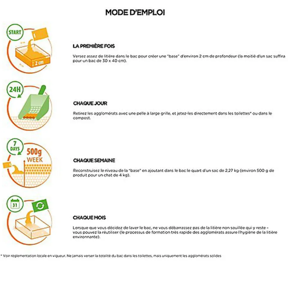 * Voir règlementation locale en vigueur. Ne jamais verser la totalité du bac dans les toilettes, mais uniquement les agglomérats solides.