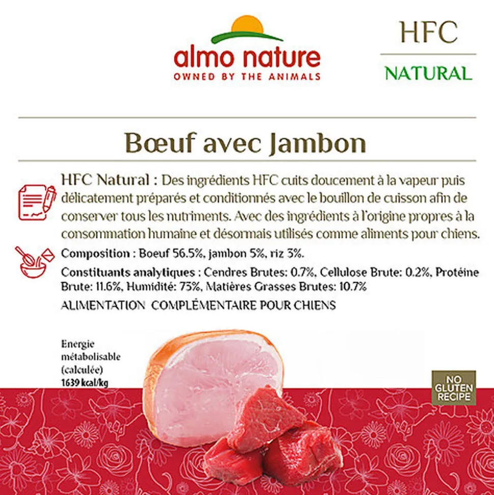 | Composition | Boeuf 50%, eau de cuisson, jambon 5%, riz 3%, |