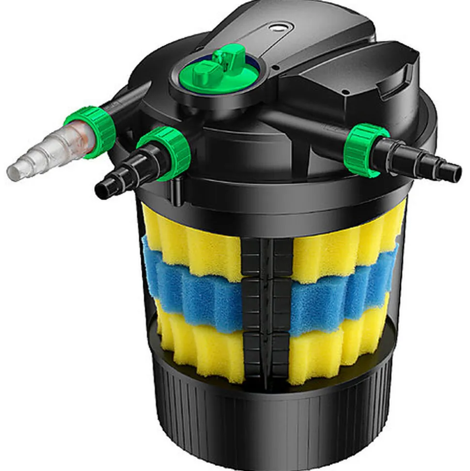 Filtre à pression autonettoyant pour bassins d’agrément. Filtration mécanique et biologique et fonction de lavage à contre-courant, avec système de nettoyage automatique par éponge de filtration mécanique : nettoyage rapide et facile sans ouvrir le filtre et sans affecter la flore bactérienne filtrante.