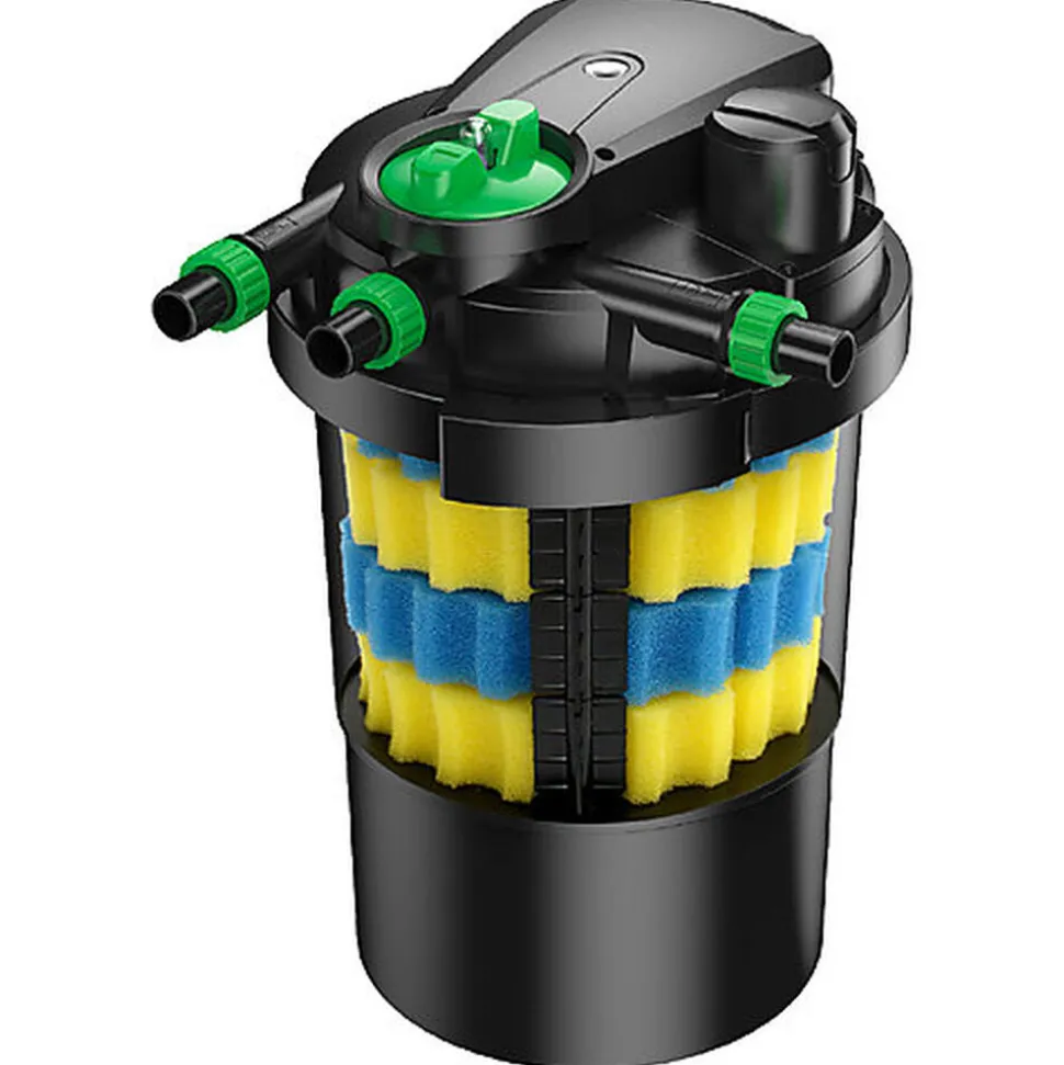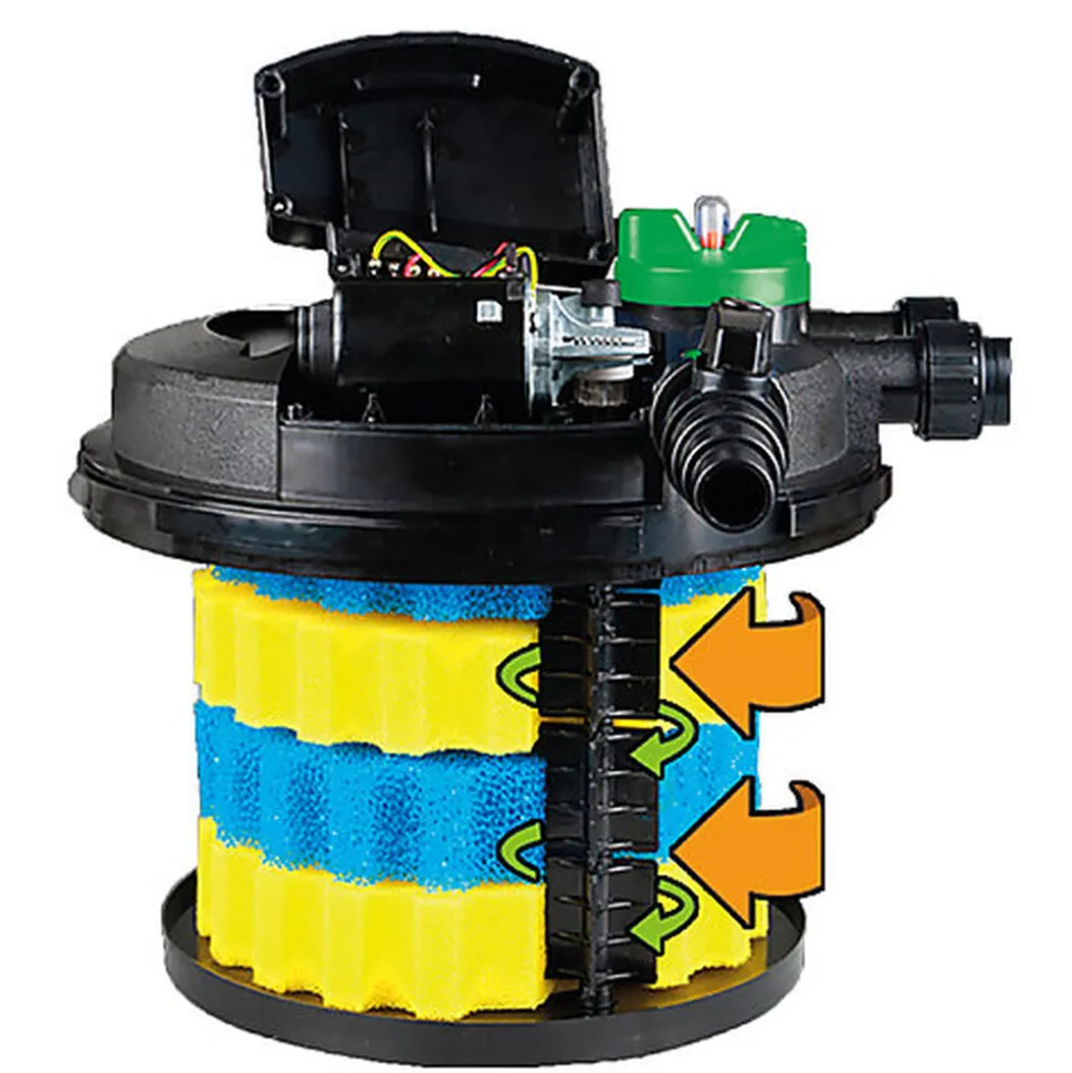 A l’intérieur il combine filtration biologique et mécanique avec stérilisation UVC permettant ainsi à la fois de purifier l’eau de manière extrêmement efficace et de éliminer les germes pathogènes et les algues vertes en suspension qui provoquent une turbidité disgracieuse ou « eau verte » dans les bassins d’ornement ., en plus de la fonction classique de lavage à contre-courant, une fonction innovante de nettoyage mécanique automatique des éponges filtrantes a été conçue.