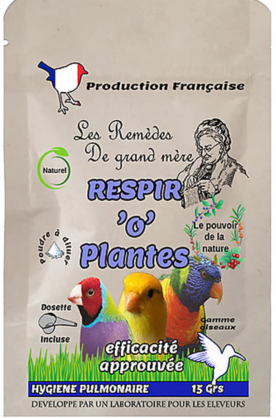 Respir’o’plantes pour oiseaux, sachet 15 grs, contribue à la lutte contre la toux et les problèmes respiratoires.