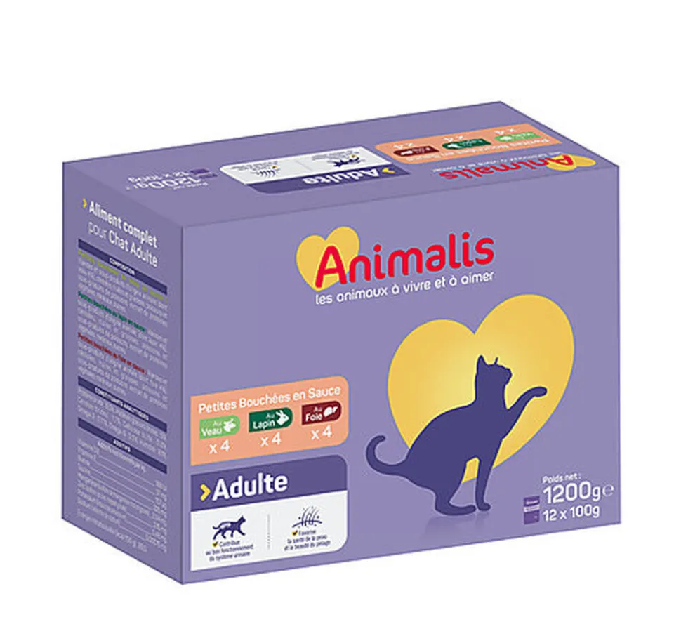 Les sachets fraicheur Animalis offrent à votre chat adulte une alimentation sans colorant ni arôme artificiel, sous forme de petites bouchées en sauce au veau, au lapin ou au foie. Cette alimentation de haute qualité contribue à la bonne hydratation de votre chat et préserve le bon fonctionnement de son système urinaire.
