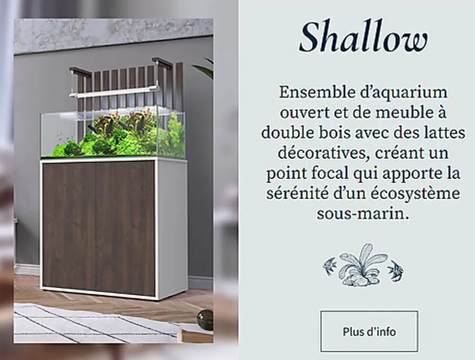 Le Shallow est un aquarium vendu avec son meuble alliant beauté et praticité grâce à un design élégant et sans rebords afin de vous offrir une vue panoramique de l’intérieur. Son meuble assure également un fonctionnement fluide et silencieux, avec une fermeture délicate ainsi qu’une praticité grâce au système LED intégré à l’intérieur.