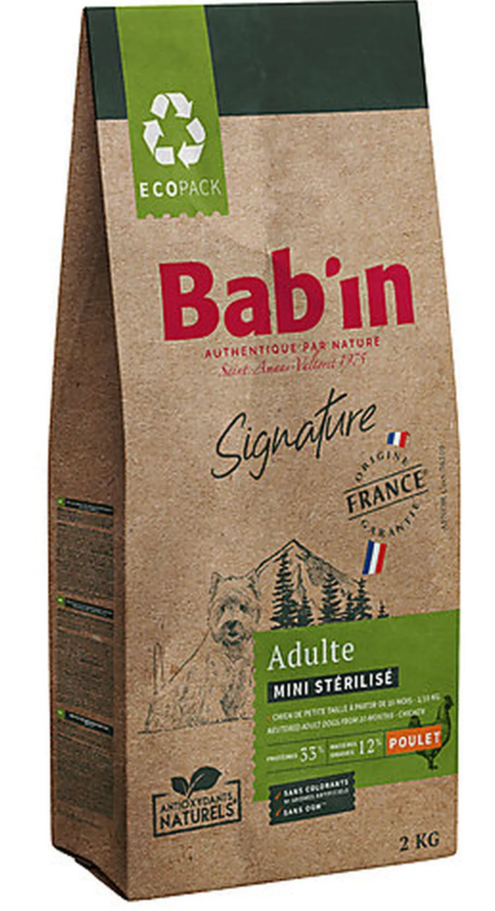 BAB’IN MINI STERILISÉ aide à maintenir un poids optimal chez les chiens stérilisés de petite taille grâce à une teneur élevée en protéines (33%), un apport modéré en matières grasses (12%) et un rationnement adapté. Le complexe de glucosamine et chondroïtine favorise le soutien articulaire (750 mg/kg).