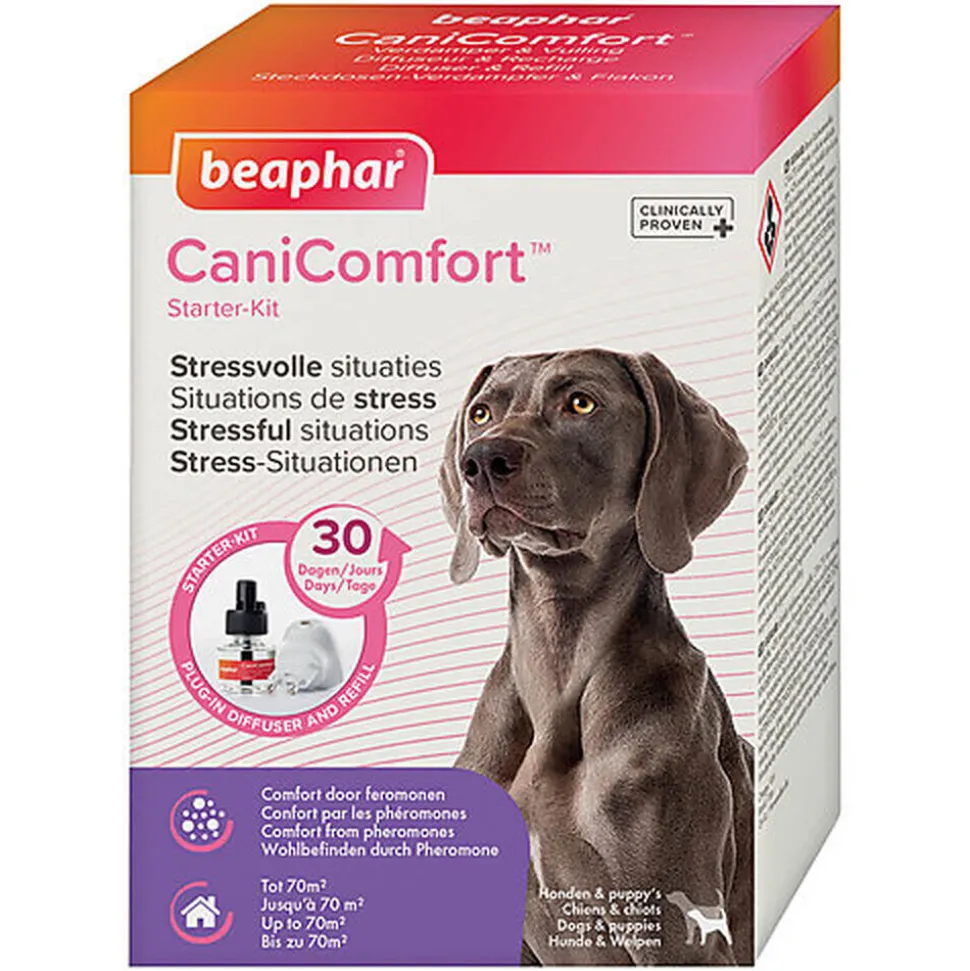 La phéromone diffusée par CaniComfort(TM) de Beaphar est une solution cliniquement prouvée pour apaiser et réduire les problèmes comportementaux des chiens et des chiots. L’utilisation d’une phéromone reconnue par votre chien l’aide à avoir une perception rassurante de son environnement. Elle permet ainsi de réduire les problèmes comportementaux comme les aboiements excessifs, les mordillages, les marquages urinaires, les léchages insistants, les griffades et les comportements craintifs ou anxieux.