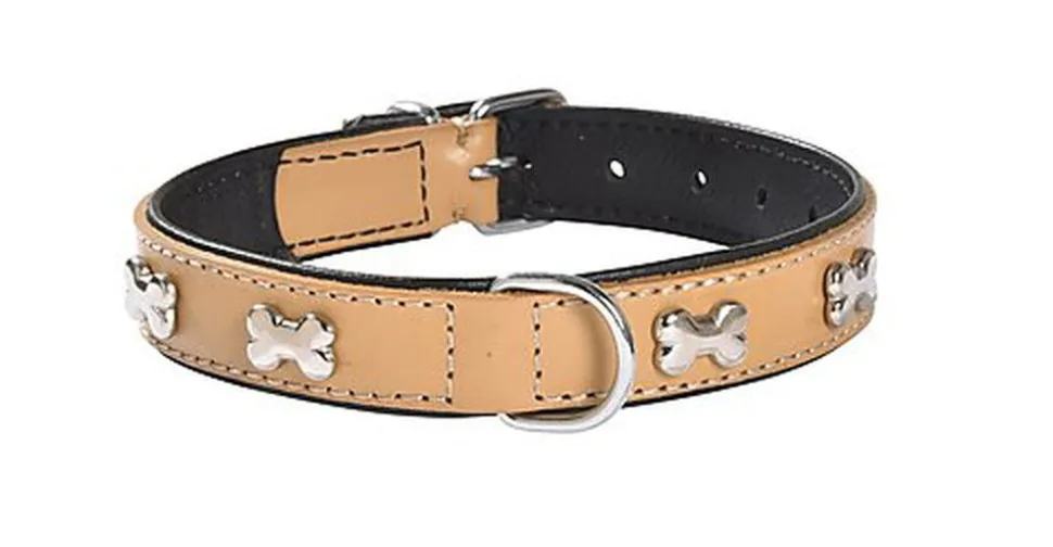 Collier en cuir extra souple, ornet de rivets « os », pour chien, et d’une belle bouclerie et surpiqûres contrastées.