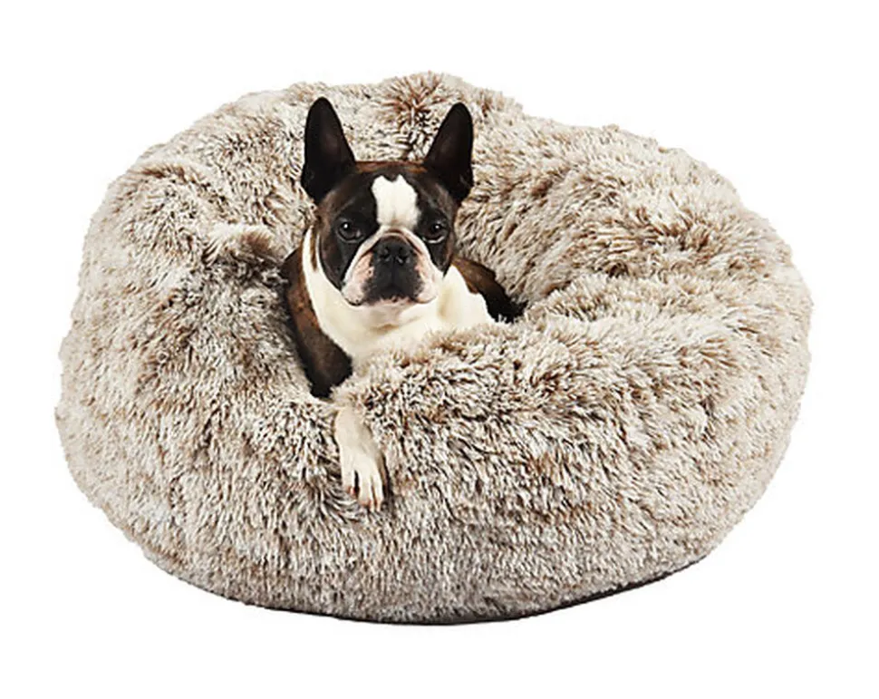 Couchage donut avec longue fourrure de couleur gris, très doux et confortable pour votre animal de compagnie.