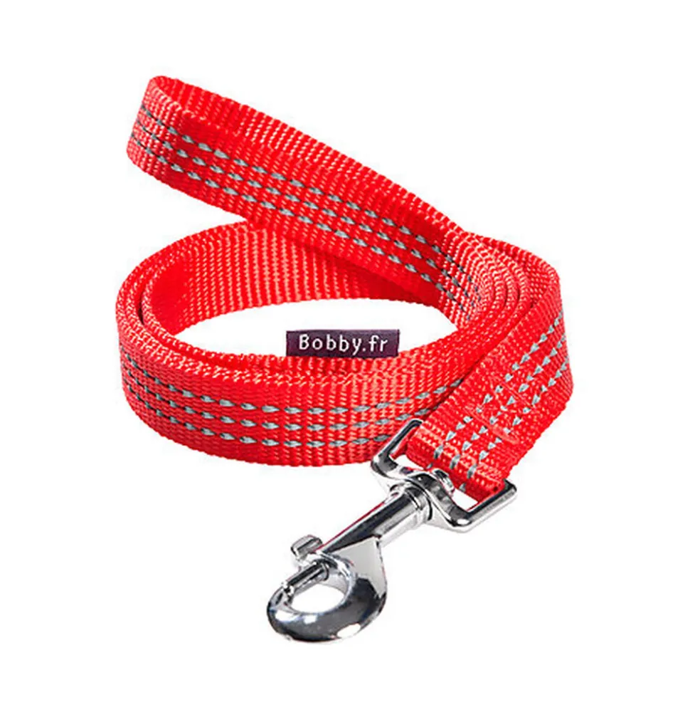 Laisse chien en nylon tressé surpiqué d’un point sellier réfléchissant permettant à votre chien d’être vu facilement.