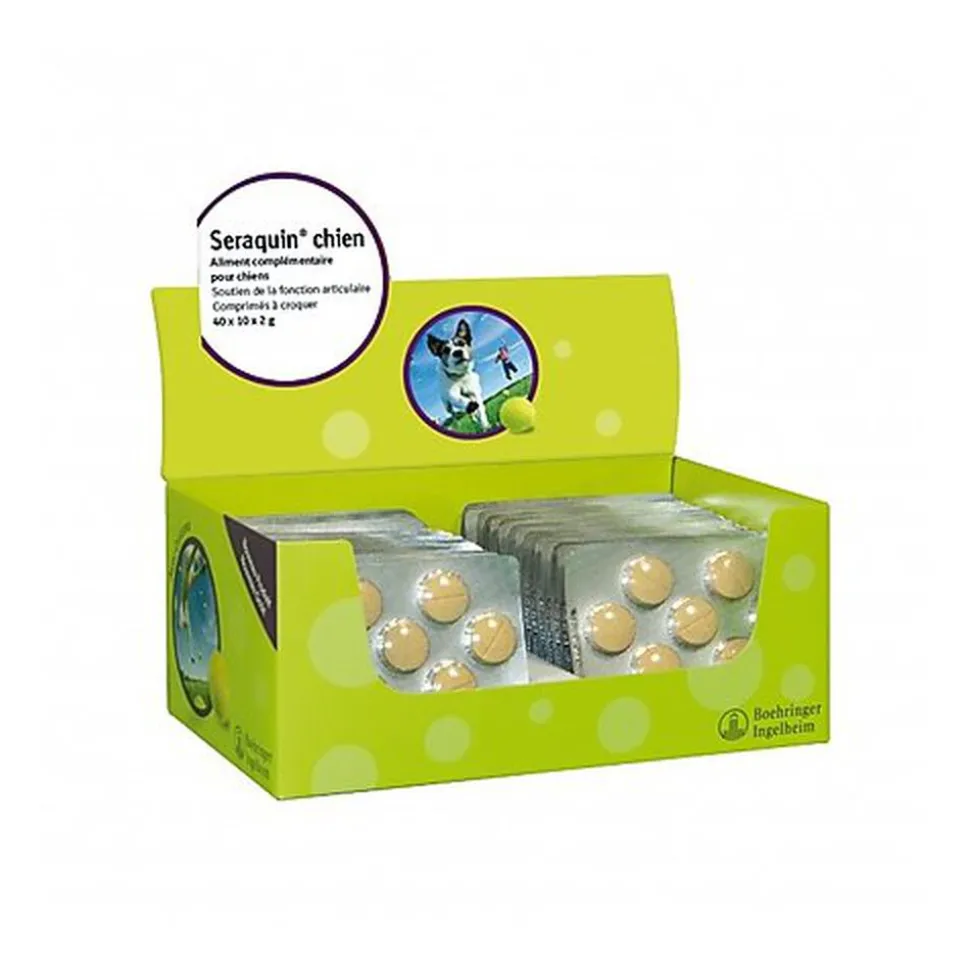 Seraquin Omega est un complément alimentaire qui permet de favoriser le soutien de la fonction articulaire chez le chien, cette nouvelle formule est appétente et contient des oméga-3.