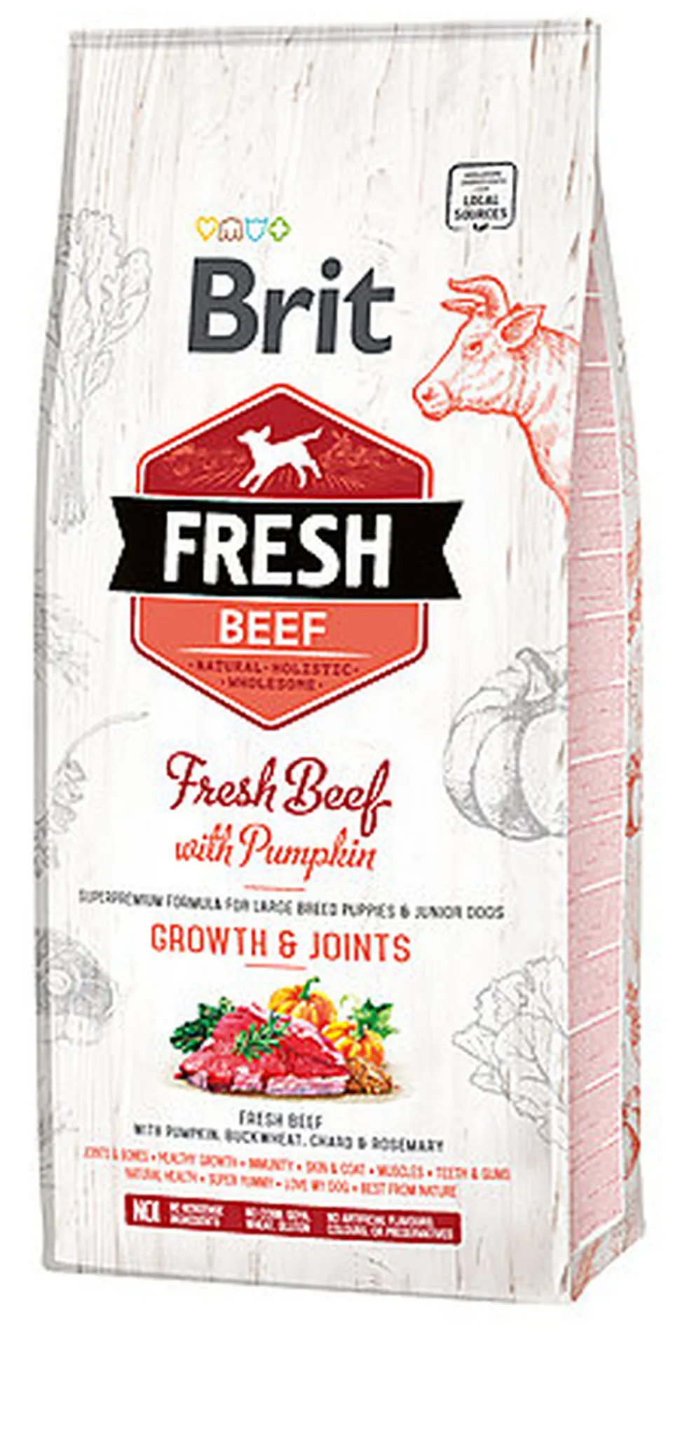 | Composition | Composition: boeuf frais (40 %), boeuf séché (25%), citrouille (10%), graisse de poulet (conservée par un mélange de tocophérols), avoine, sarrasin (5%), pommes, betterave entière, huile de saumon, levure de bière, graine de lin, foie de poulet, collagène, algues, betterave rouge potagère (0,2%), persil, romarin (0,05%), thym, calendula, pissenlit, probiotiques (Enterococcus faecium 1×109 UFC), glucosamine 1 700 mg/kg, sulfate de chondroïtine 1 300 mg/kg, fructo-oligosaccharides 220 mg/kg, β-glucanes 200 mg/kg, manno-oligosaccharides 180 mg/kg, yucca 150 mg/ kg, moules vertes 100 mg/kg. Énergie métabolisable : 3 750 kcal/kg. |