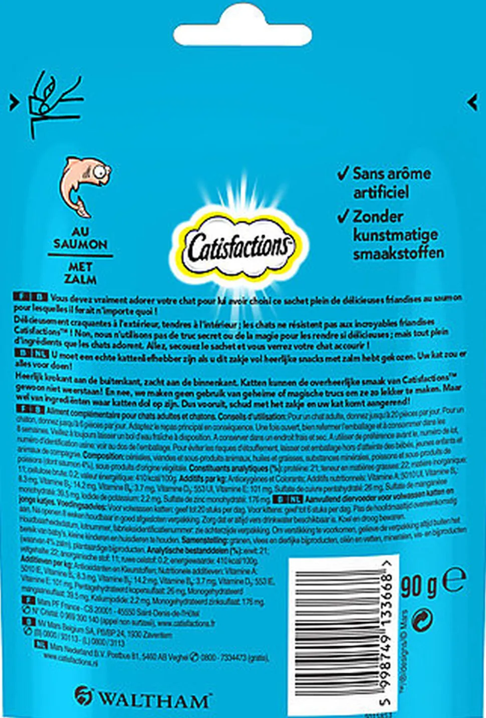 Aliment complémentaire pour chats adultes et chatons au saumon. Délicieuses friandises Catisfactions™ croustillantes à l’extérieur et avec un délicieux cœur tendre pour lesquelles les chats feraient n’importe quoi ! Moins de 2 kcal par friandise. Mis au point par nos nutritionnistes et vétérinaires du centre de Waltham, ces friandises sont sans arôme artificiel. Trouvez la saveur préférée de votre chat, secouez, et vous verrez votre chat accourir ! Les friandises pour chats Catisfactions™ sont disponibles en format sachet refermable pour une meilleure conservation.