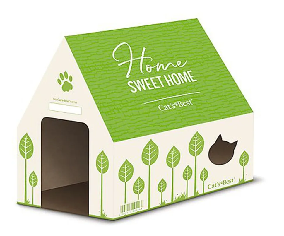 Cat’s Best Original 10L, édition limitée : 1 sac de litière Original 10L dans une boite en carton qui se transforme en une jolie maison pour chat, avec une entrée et des fenêtres pour surveiller l’extérieur. Cat’s Best Original est une litière végétale à base de granulés de bois, agglomérante, anti-odeur et dépoussiérée