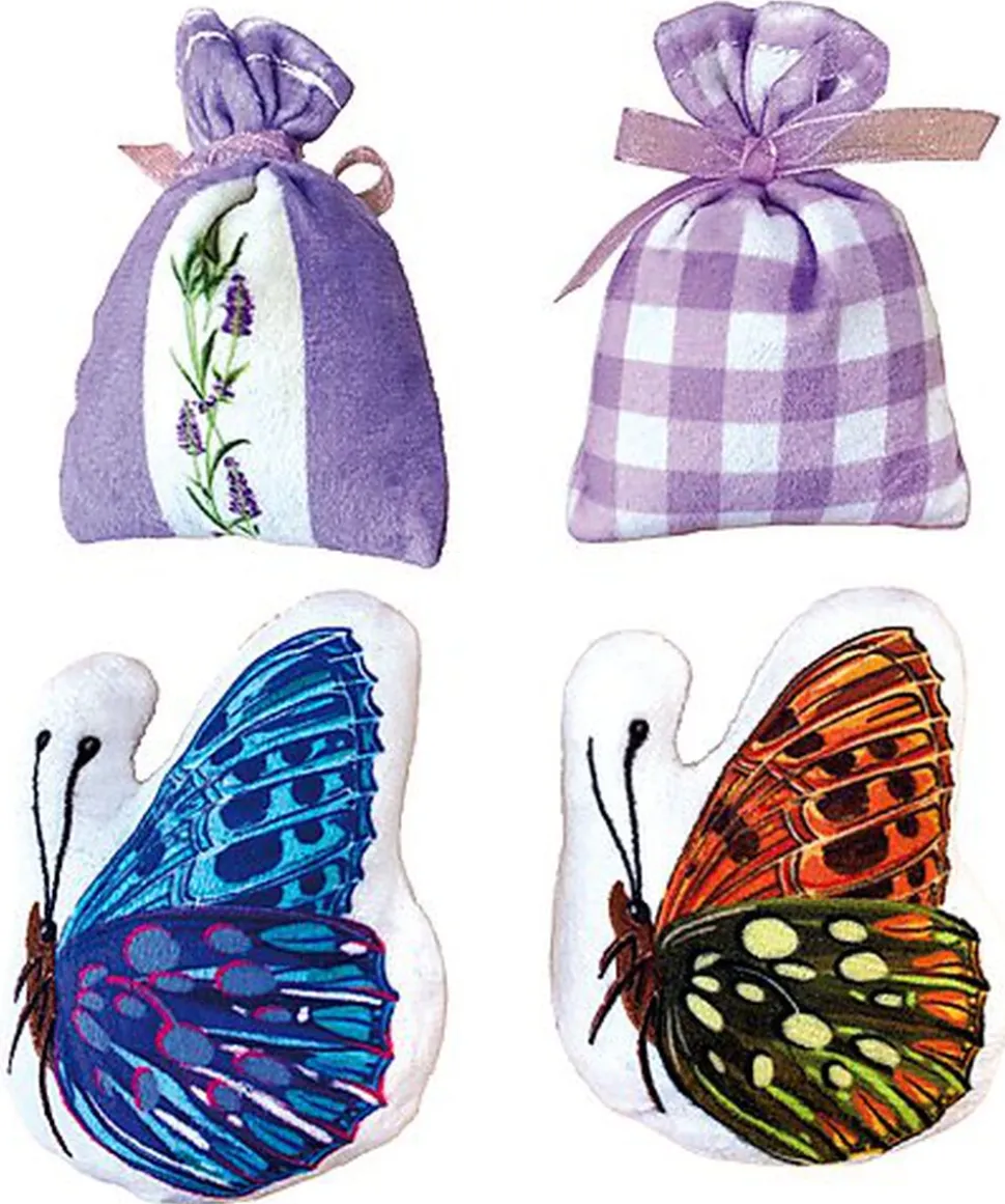 Il existe deux formes différentes: des petits sachets lavande et des papillons pour rappeler le sud de la France. Les papillons sont en matière douce avec un effet soft touch, génial pour les coussinets des chats.