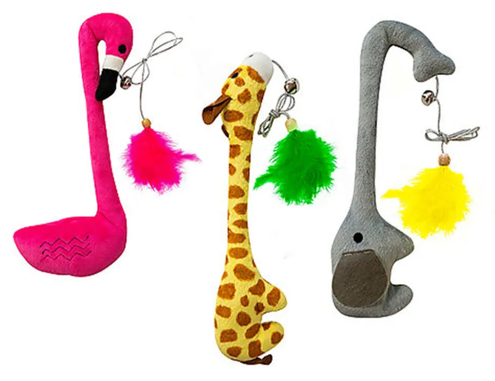 Jouet chat en forme de flamant rose, girafe et éléphant avec plume et grelot. Vous pouvez jouer avec votre chat grâce au fil.