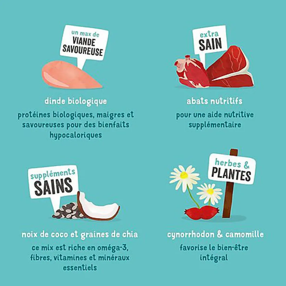 Des aliments savoureux avec un maximum de viande fraîche. Des aliments naturels et savoureux bons pour eux, bien pour nous et notre planète. Nous utilisons exclusivement les meilleures morceaux de dinde (ni séché, ni précuit, ni hautement transformé ou sous forme de farine animale) pour favoriser la bonne digestion. Nous relevons le tout d’un mélange hyper sain de fruits, légumes et aromates. Nous faisons ensuite cuire la préparation à feu doux, en petites portions, pour préserver toute sa saveur et ses bienfaits.
