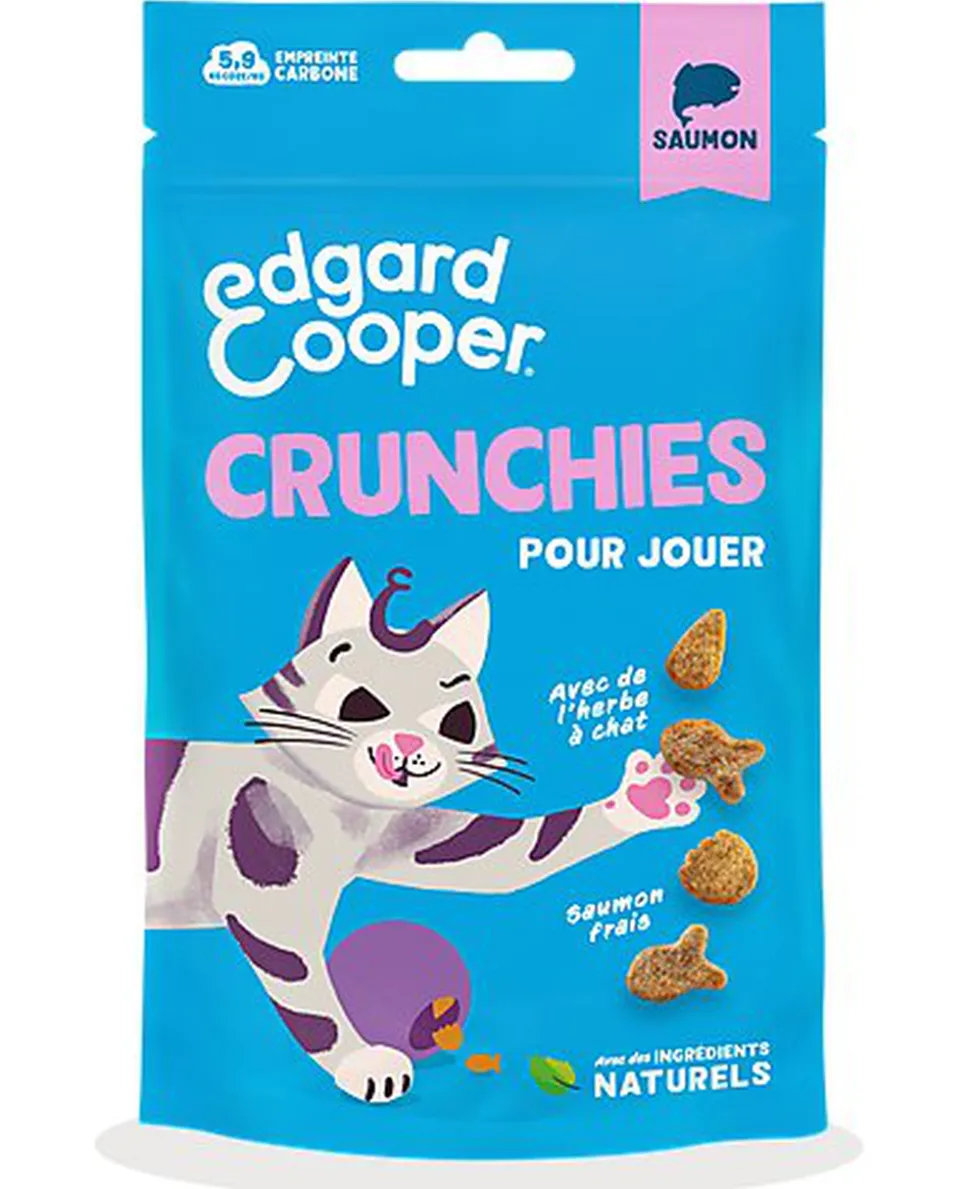 Sans céréales ni sucres ajoutés, nos Crunchies sont préparés avec du saumon frais et des ingrédients naturels, le tout relevé d’une pincée d’herbe à chat.