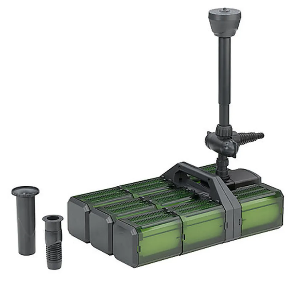 Filtres intérieurs de bassin – spécialement conçus pour des applications individuelles. L‘unité se compose d‘une pompe et de modules de filtration individuels, qui peuvent être réduits ou ajoutés à volonté en fonction de la taille du bassin ou de la population de poissons. Convient également aux faibles niveaux eaux grâce à sa construction extraplate