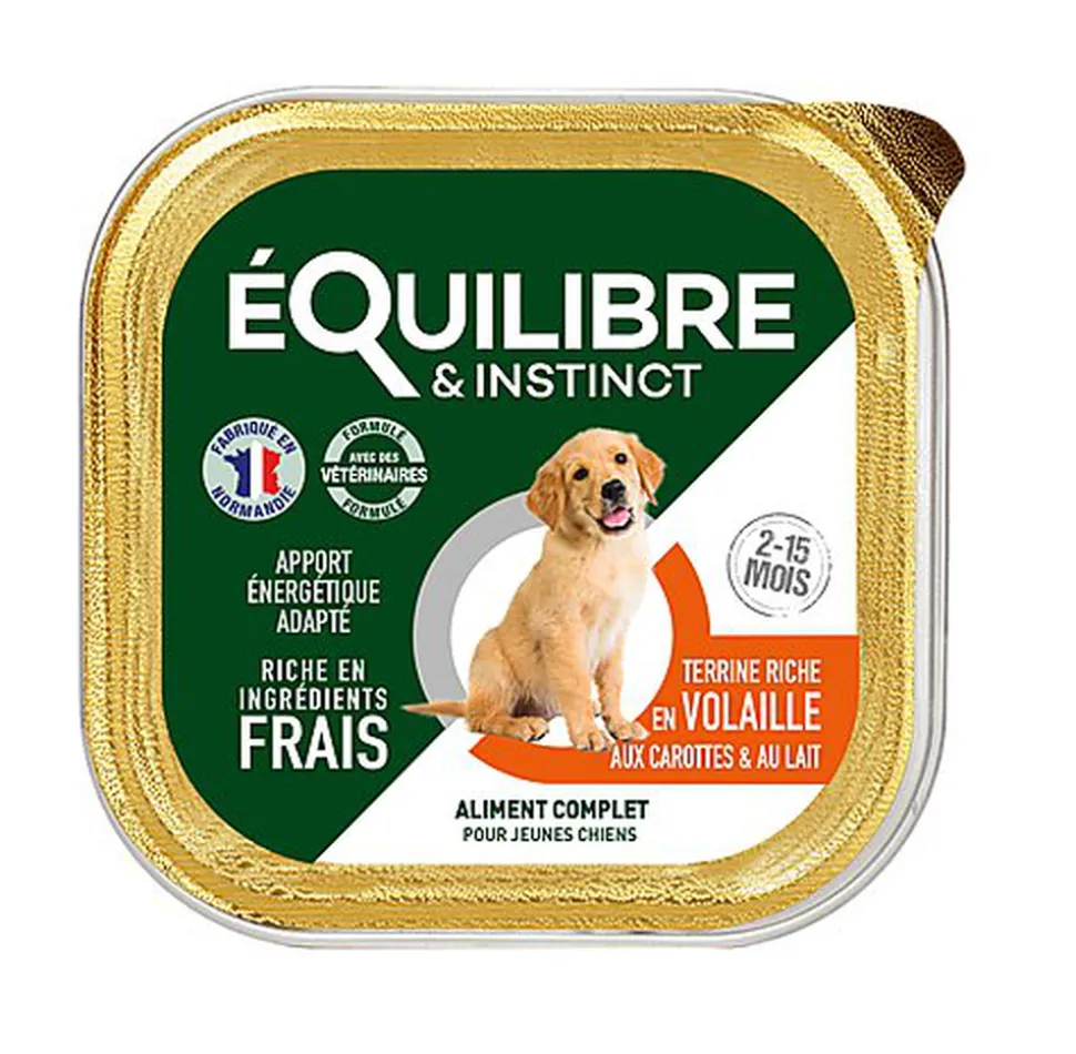Les pâtées Equilibre & Instinct pour chiot sont riches en volaille, leur recette offre un apport énergétique adapté aux besoins d’un chien en pleine croissance.