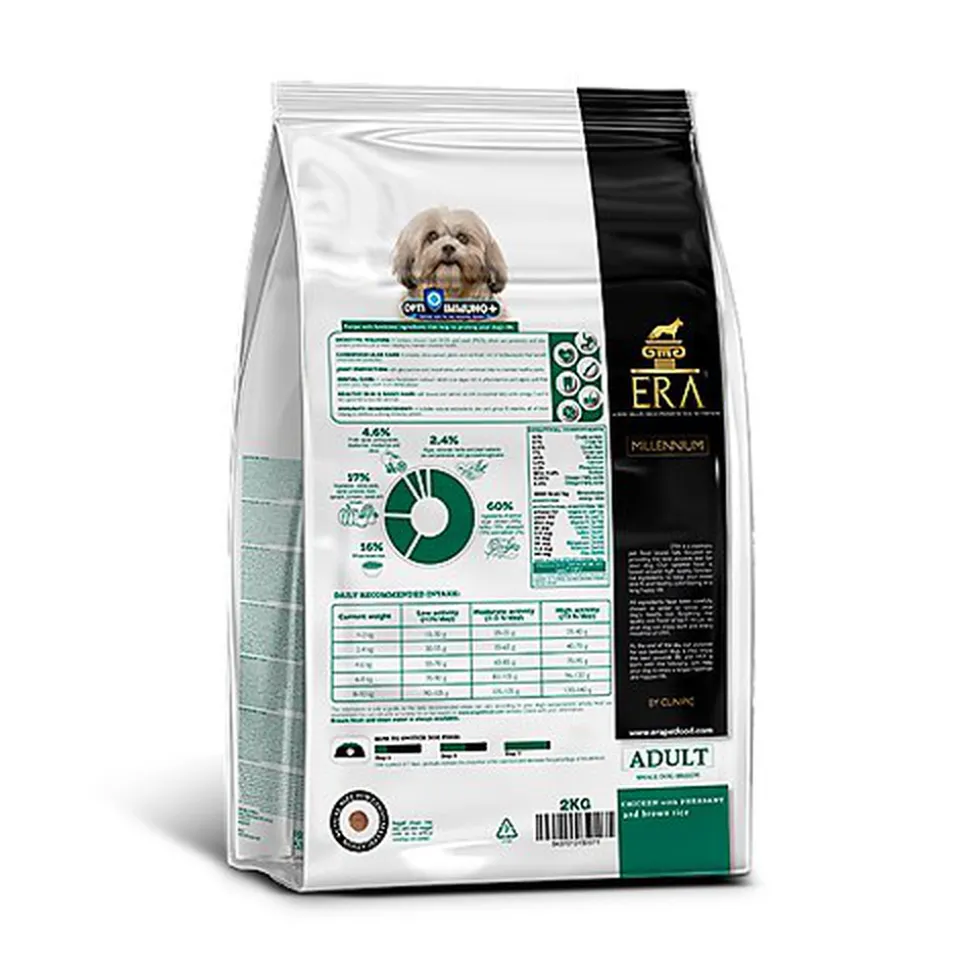 ERA Millennium Poulet et Faisan est une alimentation complète et équilibrée pour les chiens adultes de petites races (<10 kg). Sa formule exclusive offre une teneur élevée en protéines et un mélange soigneusement élaboré d’ingrédients fonctionnels qui aideront votre chien à avoir des os solides et une santé optimale. ERA Millennium Poulet et Faisan pour chiens adultes de petites races contient 60 % d’ingrédients d’origine animale et du poulet frais désossé comme ingrédient principal, ce qui lui confère une grande digestibilité et un goût excellent.