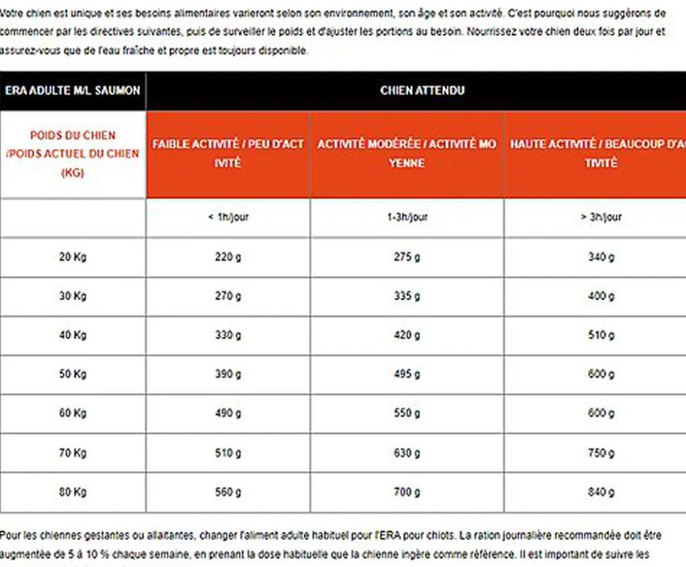 | Composition | Saumon frais (27 %), protéine de hareng déshydratée (24 %), riz complet (11 %), pois jaunes (10 %), graisse de poulet (7 %, conservée avec des tocophérols naturels), patate douce (5 %), pulpe de pomme déshydratée (3 %), protéine de pois (3 %), pulpe de betterave déshydratée (3 %), huile de saumon (2 %), graines de lin (1,5 %), épinards déshydratés (0,5 %), citrouille (0,5 %), caroube déshydratée (0,5 %), pulpe de tomate déshydratée (0,5 %), algues marines déshydratées (Ascophyllum nodosum, 0,4 %), carbonate de calcium (0,363 %), grenade déshydratée (0,2 %), myrtilles déshydratées (0,2 %), canneberges déshydratées (0,2 %), glucosamine (0,026 %), levure (source de mannan-oligosaccharides, 0,02 %), extrait d’agrumes (0,02 %), sulfate de chondroïtine (0,016 %), racine de chicorée (source de fructo-oligosaccharides, 0,01 %), yucca Mojave (0,01 %), calendula déshydratée (0,01 %), moules à lèvres vertes (0,005 %), graines de chardon-Marie déshydratées (0,005 %), échinacée déshydratée (Echinacea purpurea, 0,005 %), thym déshydraté (0,005 %), romarin déshydraté (0,005 %). |