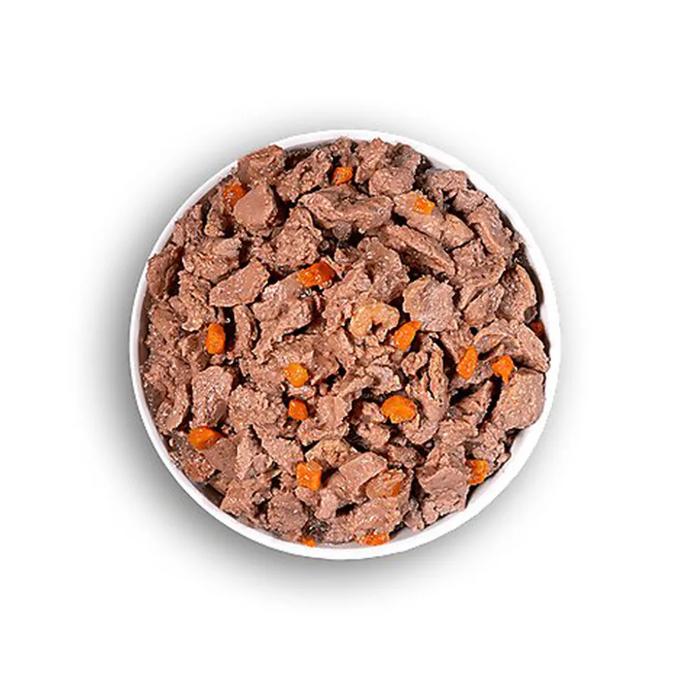 | Composition | Composition : Filets avec 85 % de viande (poulet (66 %), foie (15 %), truite (4 %)), farine de pois (2 %), carottes (1 %), lignocellulose (0,7 %), carbonate de calcium (0,3 %), romarin déshydraté (0,1 %). |