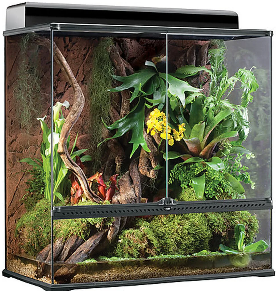 Le terrarium en verre Exo Terra, conçu par des herpétologistes européens, est l’habitat idéal pour les reptiles et les amphibiens. Les portes avant facilitent l’entretien et le nourrissage. Dimensions : 90x45x90 centimètres.