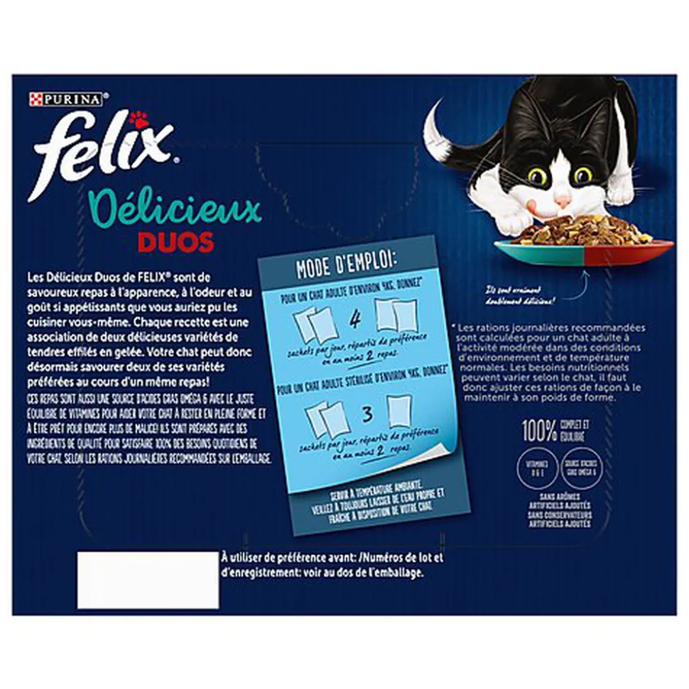 Les Délicieux Duos de FELIX® sont de savoureux repas à l’apparence, à l’odeur et au goût si appétissants que vous auriez pu les cuisiner vous-même. Chaque recette est une association de deux délicieuses variétés de tendres effilés en gelée. Votre chat peut donc désormais savourer deux de ses variétés préférées au cours d’un même repas ! Ces repas sont aussi une source d’acides gras Oméga-6 avec le juste équilibre de vitamines pour aider votre chat à rester en pleine forme et à être prêt pour encore plus de malice ! Ils sont préparés avec des ingrédients de qualité pour satisfaire 100% des besoins quotidiens de votre chat, selon les rations journalières recommandées sur l’emballage.Et ce n’est pas tout ! Les Délicieux Duos de FELIX® sont disponibles dans une large gamme de délicieuses recettes en gelée pour satisfaire les envies de variété de votre chat.Ils sont vraiment doublement délicieux ! FELIX®, tellement irrésistible !