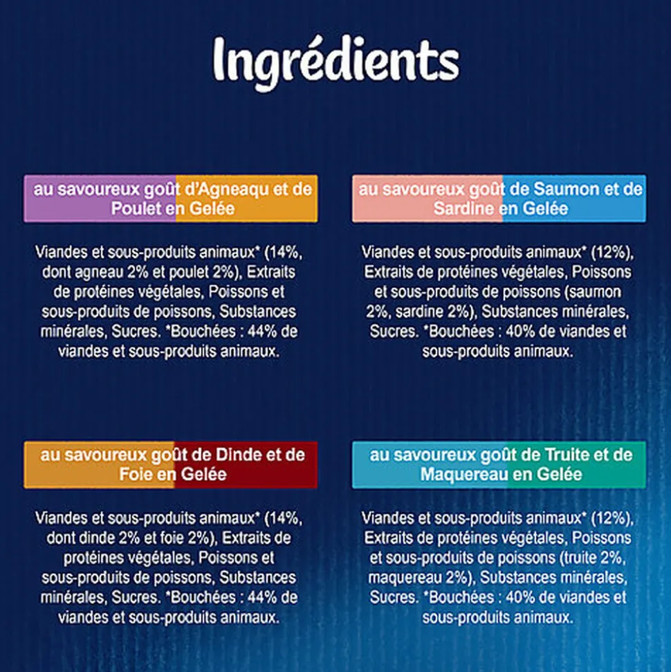 | Composition | Agneau et Poulet : Viandes et sous-produits animaux (dont agneau, poulet), Extraits de protéines végétales, Poissons et sous-produits de poissons, Acides aminés, épaississants, substances minérales, sucres, vitamines.Truite et Maquereau : Viandes et sous-produits animaux* (12%), Extraits de protéines végétales, Poissons et sous-produits de poissons (truite 2%, maquereau 2%), Substances minérales, Sucres. *Bouchées: 40% de viandes et sous-produits animaux.Saumon et Sardine : Viandes et sous-produits animaux* (12%), Extraits de protéines végétales, Poissons et sous-produits de poissons (saumon 2%, sardine 2%), Substances minérales, Sucres. *Bouchées: 40% de viandes et sous-produits animaux.Dinde et Foie : Viandes et sous-produits animaux (dont dinde, foie), Extraits de protéines végétales, Poissons et sous-produits de poissons, Acides aminés, Épaississants, Substances minérales, Sucres, Vitamines. |