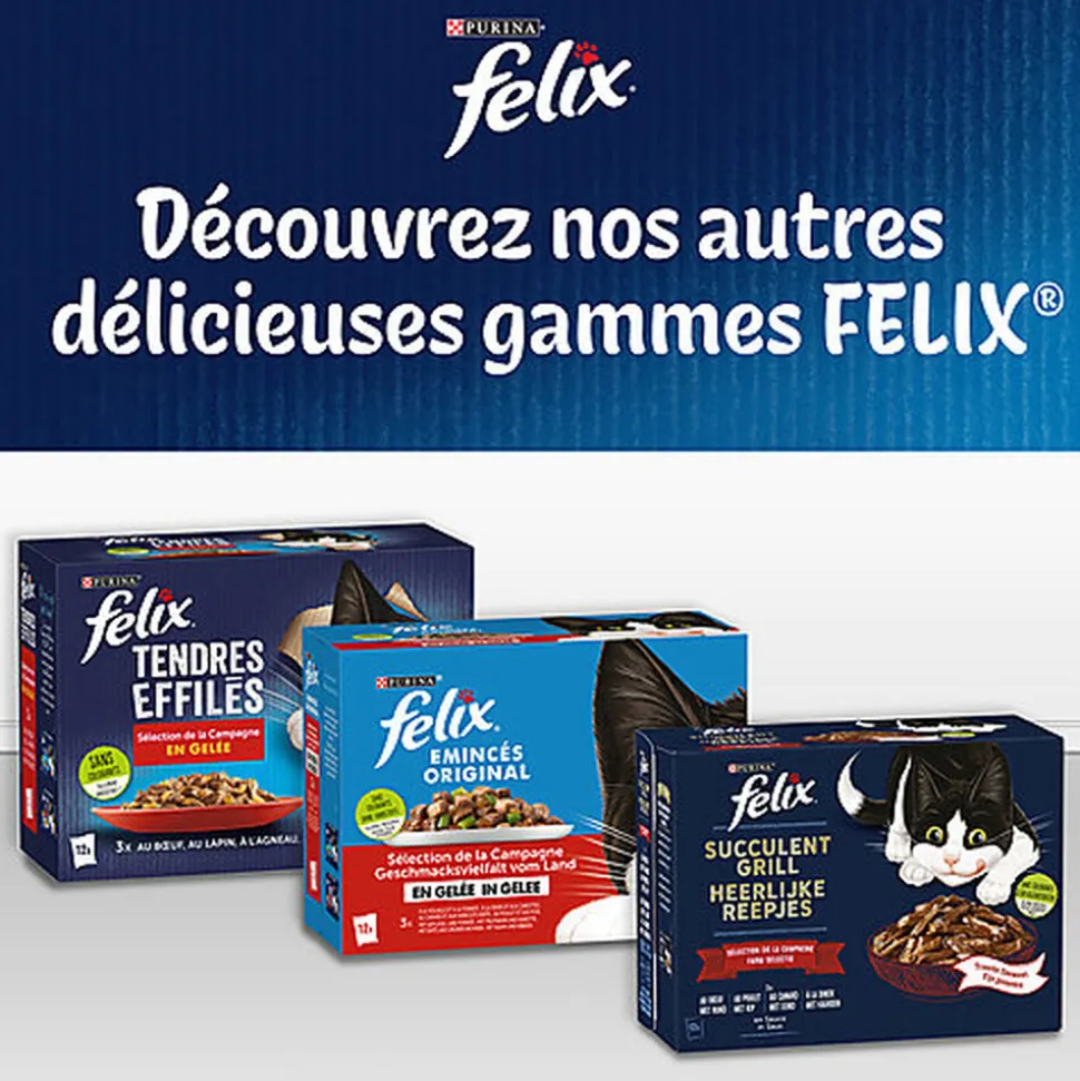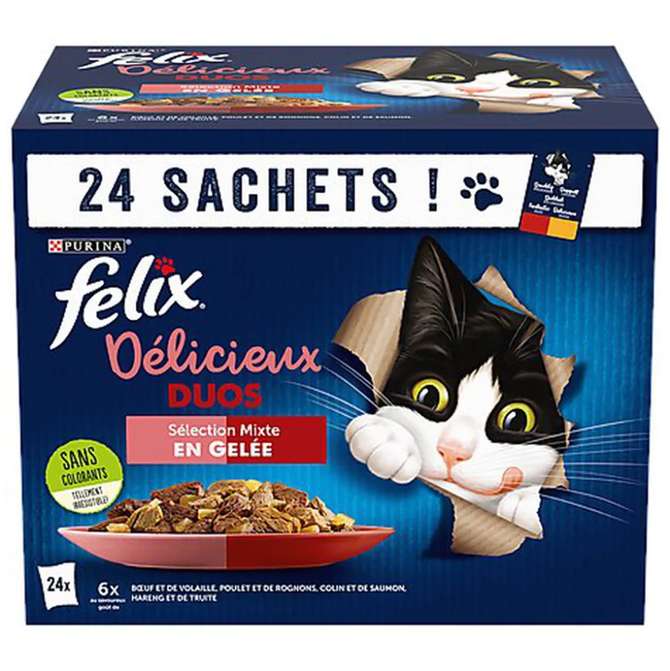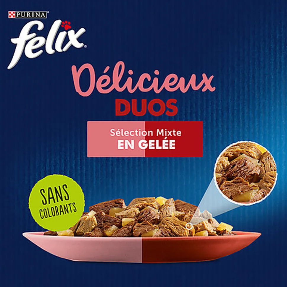 Les Délicieux Duos de FELIX® sont de savoureux repas à l’apparence, à l’odeur et au goût si appétissants que vous auriez pu les cuisiner vous-même. Chaque recette est une association de deux délicieuses variétés de tendres effilés en gelée. Votre chat peut donc désormais savourer deux de ses variétés préférées au cours d’un même repas ! Ces repas sont aussi une source d’acides gras Oméga-6 avec le juste équilibre de vitamines pour aider votre chat à rester en pleine forme et à être prêt pour encore plus de malice ! Ils sont préparés avec des ingrédients de qualité pour satisfaire 100% des besoins quotidiens de votre chat, selon les rations journalières recommandées sur l’emballage.Et ce n’est pas tout ! Les Délicieux Duos de FELIX® sont disponibles dans une large gamme de délicieuses recettes en gelée pour satisfaire les envies de variété de votre chat.Ils sont vraiment doublement délicieux ! FELIX®, tellement irrésistible !