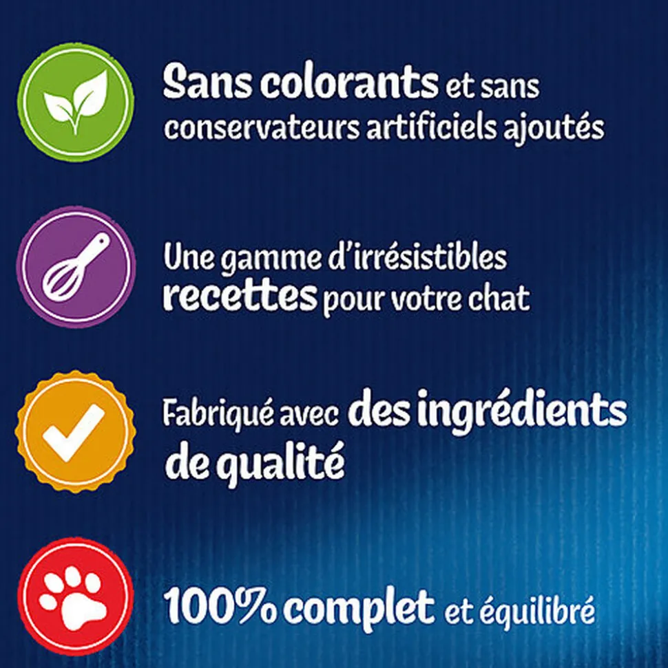 | Composition | Hareng et Truite : Viandes et sous-produits animaux* (12%), Extraits de protéines végétales, Poissons et sous-produits de poissons (hareng 2%, truite 2%), Substances minérales, Sucres. *Bouchées: 40% de viandes et sous-produits animaux.Colin et Saumon : Viandes et sous-produits animaux* (12%), Extraits de protéines végétales, Poissons et sous-produits de poissons (colin 2%, saumon 2%), Substances minérales, Sucres. *Bouchées: 40% de viandes et sous-produits animaux.Agneau et Poulet : Viandes et sous-produits animaux (dont agneau, poulet), Extraits de protéines végétales, Poissons et sous-produits de poissons, Acides aminés, épaississants, substances minérales, sucres, vitamines.Poulet et Rognons : Viandes et sous-produits animaux* (14%, dont poulet 2%, rognons 2%), Extraits de protéines végétales, Poissons et sous-produits de poissons, Substances minérales, Sucres. *Bouchées: 44% de viandes et sous-produits animaux. |