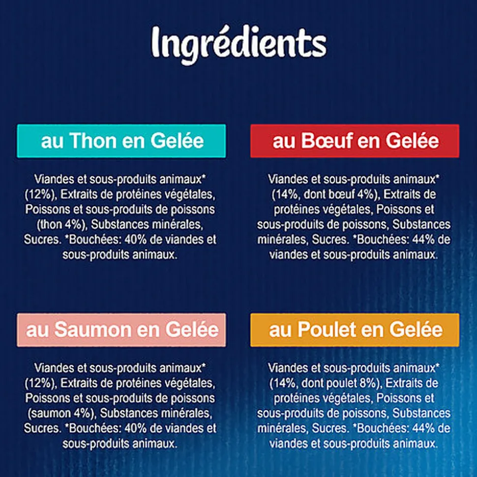 | Composition | BŒUF : Viandes et sous-produits animaux* (14%, dont bœuf 4%), Extraits de protéines végétales, Poissons et sous-produits de poissons, Substances minérales, Sucres. *Bouchées: 44% de viandes et sous-produits animaux.SAUMON : Viandes et sous-produits animaux* (12%), Extraits de protéines végétales, Poissons et sous-produits de poissons (saumon 4%), Substances minérales, Sucres. *Bouchées: 40% de viandes et sous-produits animaux.THON : Viandes et sous-produits animaux* (12%), Extraits de protéines végétales, Poissons et sous-produits de poissons (thon 4%), Substances minérales, Sucres. *Bouchées: 40% de viandes et sous-produits animaux.POULET : Viandes et sous-produits animaux* (14%, dont poulet 8%), Extraits de protéines végétales, Poissons et sous-produits de poissons, Substances minérales, Sucres. *Bouchées: 44% de viandes et sous-produits animaux. |