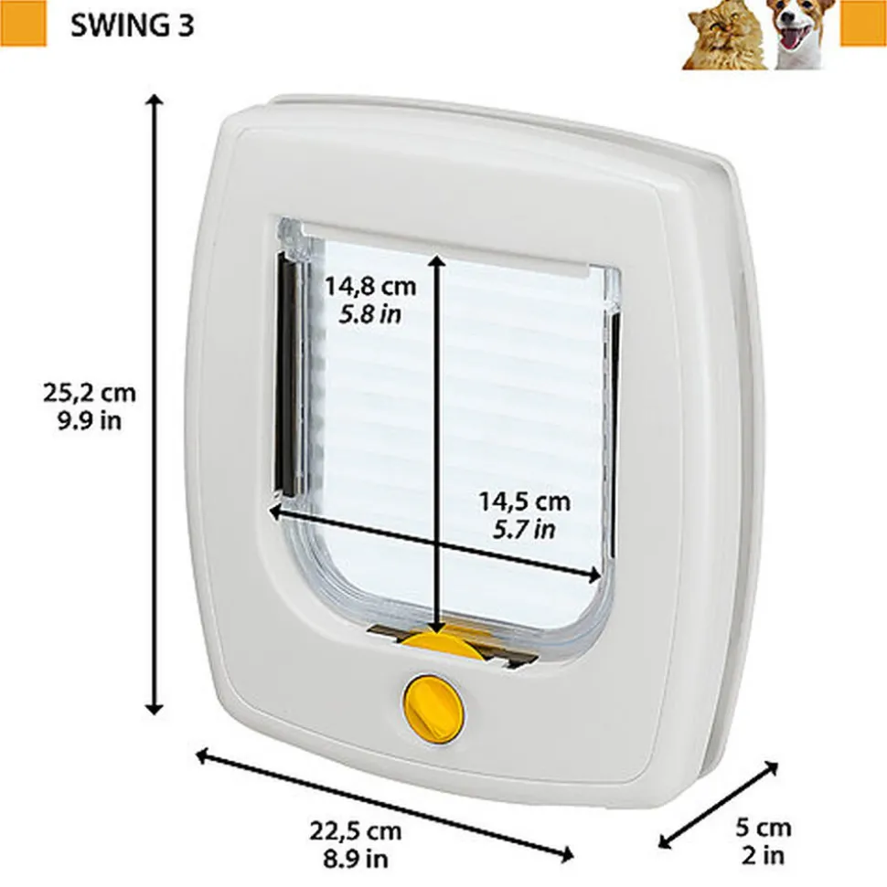 Enfin, un indicateur de passage (fourni avec Swing 5 et 7) vous aidera à savoir si votre animal est à l’intérieur ou à l’extérieur, il représente une petite languette, placée au bas de la porte qui se placera dans la direction prise par votre petit animal. Les grands modèles disposent d’un tunnel de 5 cm permettant ainsi de s’adapter à toute structure et pouvant être coupé (sauf pour les modèles Swing 7 et Swing microchip qui possèdent un mécanisme délicat).