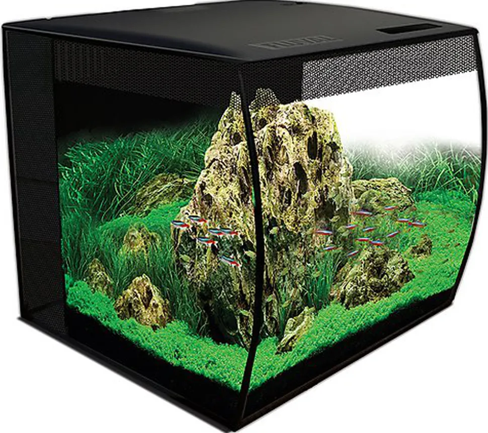 L’aquarium équipé offre un design contemporain grâce à sa paroi avant arrondie, est muni d’un puissant système de filtration en plusieurs étapes et d’un appareil d’éclairage à DEL ingénieux.