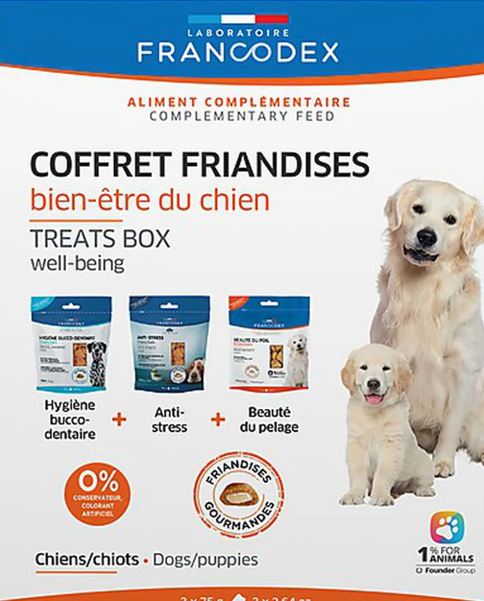 Coffret francodex comportant 3 types de friandises pour l’accompagnement santé du quotidien des chiens.