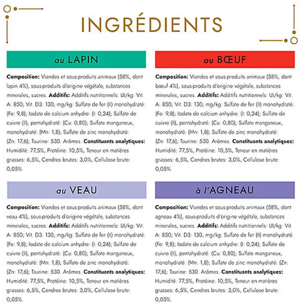 | Composition | Au Lapin :Viandes et sous-produits animaux (dont lapin 4%), sous-produits d’origine végétale, substances minérales, sucres.Au Bœuf :Viandes et sous-produits animaux (dont bœuf 4%), sous-produits d’origine végétale, substances minérales, sucres.A l’Agneau :Viandes et sous-produits animaux (dont agneau 4%), sous-produits d’origine végétale, substances minérales, sucres.Au Veau :Viandes et sous-produits animaux (dont veau 4 %), substances minérales, sous-produits d’origine végétale, sucres. |