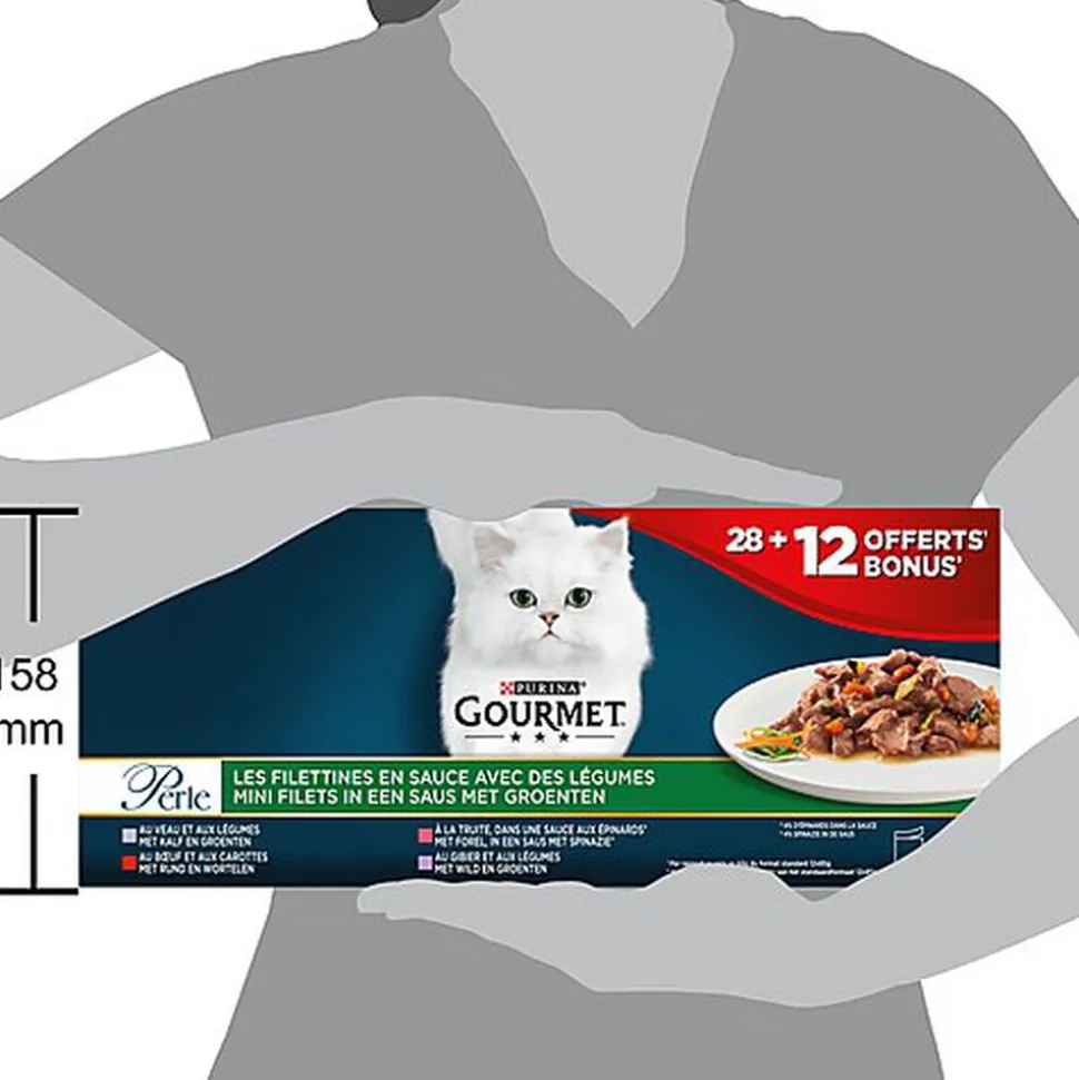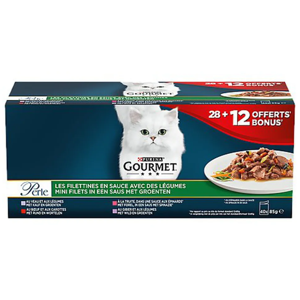 | Composition | Veau-Légumes :Viandes et sous-produits animaux (14%, dont veau 4%), Extraits de protéines végétales, Poissons et sous-produits de poissons, Substances minérales, Légumes (0,7% de légumes séchés, équivalent à 6,3% de légumes), Sucres.Gibier-Légumes :Viandes et sous-produits animaux (15%, dont gibier 4%), Extraits de protéines végétales, Poissons et sous-produits de poissons, Substances minérales, Légumes (0,7% de légumes séchés, équivalent à 6,3% de légumes), Sucres.Bœuf-Carottes :Viandes et sous-produits animaux (15%, dont bœuf 4%), Extraits de protéines végétales, Poissons et sous-produits de poissons, Substances minérales, Légumes (0,6% de carottes séchées, équivalent à 5,4% de carottes), Sucres.Truite-Epinards :Viandes et sous-produits animaux, Extraits de protéines végétales, Poissons et sous-produits de poissons (truite 4%), Substances minérales, Légumes (0,3% d’épinards séchés, équivalent à 4% d’épinards dans la sauce), Sucres. |