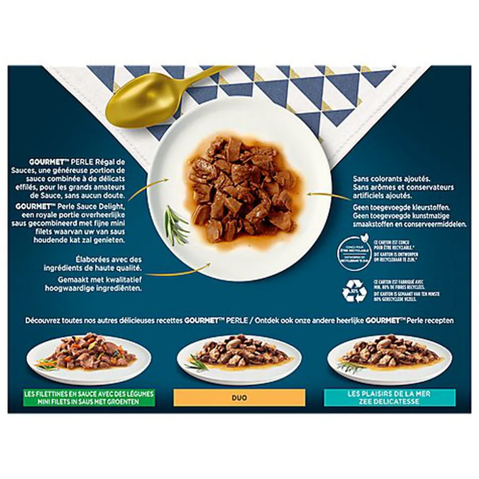 Si votre chat n’en faisait qu’à sa guise, ses repas ne seraient composés que de Sauce, encore de la Sauce, et toujours plus de Sauce. C’est la raison pour laquelle GOURMET™ PERLE a créé Régal de Sauces. Chaque recette PERLE Régal de Sauces commence toujours avec une généreuse portion de Sauce, délicate et savoureuse. Elle se marie ensuite à de délicats effilés au Poulet, au Bœuf ou aux Poissons. Vous pouvez être sûr que chaque recette GOURMET™ PERLE Régal de Sauces est pensée pour ravir le palais de votre chat, chaque jour. Toutes les recettes GOURMET™ PERLE Régal de Sauces sont élaborées avec des ingrédients de haute qualité et sont sans colorants ajoutés, sans conservateurs artificiels ajoutés et sans arômes artificiels ajoutés. GOURMET™ PERLE Régal de Sauces : un repas exquis pour les grands amateurs de Sauce, sans aucun doute.