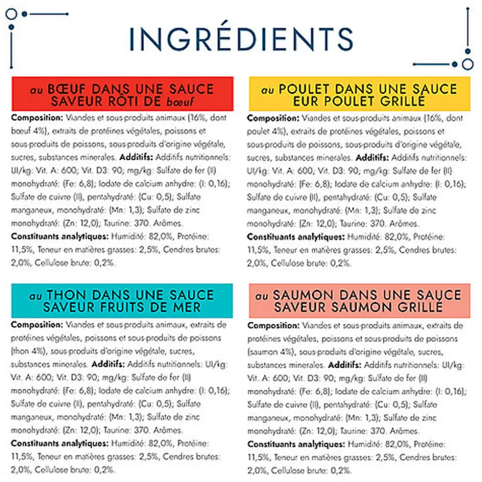 | Composition | Au thon :Viandes et sous-produits animaux, Extraits de protéines végétales, Poissons et sous-produits de poissons (thon 4%), Substances minérales, Sous-produits d’origine végétale, Sucres.Au Saumon : Viandes et sous-produits animaux, Extraits de protéines végétales, Poissons et sous-produits de poissons (saumon 4%), Substances minérales, Sous-produits d’origine végétale, Sucres.Au Bœuf : Viandes et sous-produits animaux (16%, dont bœuf 4%), Extraits de protéines végétales, Poissons et sous-produits de poissons, Substances minérales, Sucres, Sous-produits d’origine végétale.Au Poulet : Viandes et sous-produits animaux (15%, dont poulet 4%), Extraits de protéines végétales, Poissons et sous-produits de poissons, Substances minérales, Sous-produits d’origine végétale, Sucres. |