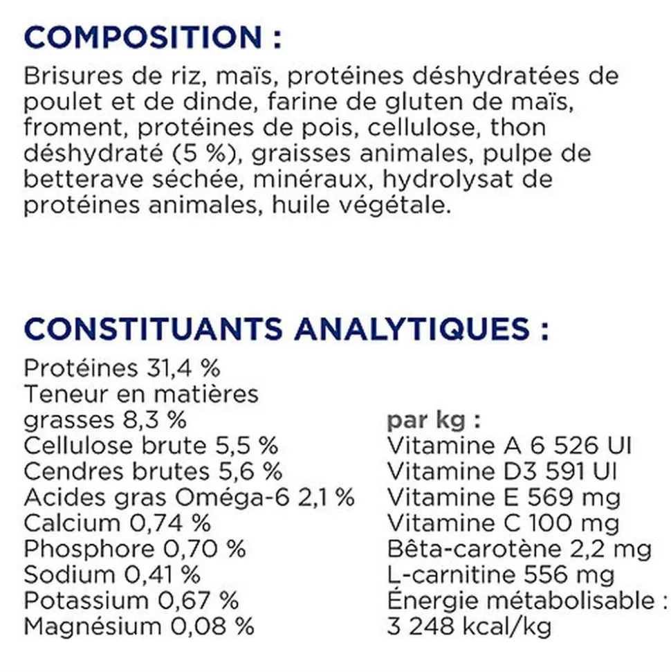 | Composition | Au Thon : Maïs moulu, protéines déshydratées de poulet et de dinde, farine de gluten de maïs, riz moulu, cellulose, protéines déshydratées de thon (9 %), pulpe de betterave séchée, farine de son de pois, graisses animales, hydrolysat, chlorure de potassium, L-carnitine, sulfate de calcium, DL-méthionine, hydrochlorure de L-lysine, sel, taurine, L-tryptophane, vitamines et oligo-éléments. Agents conservateurs naturels (tocophérols, acide citrique et extrait de romarin). |