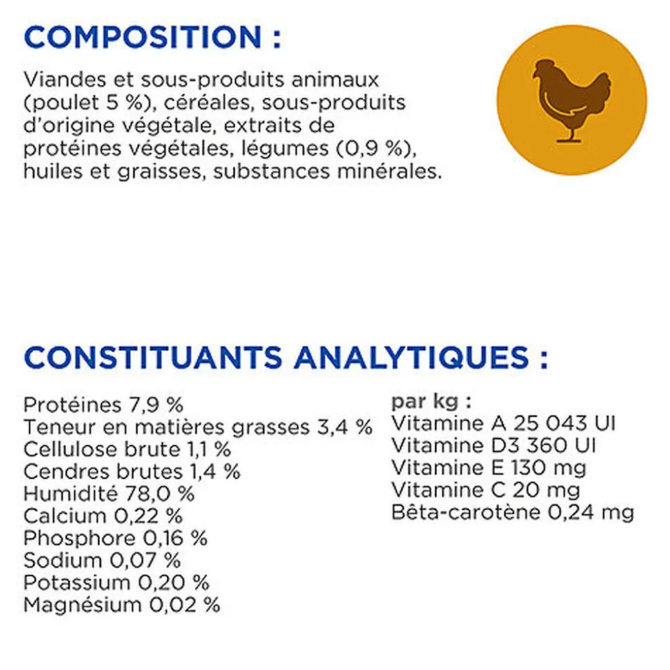 | Directives d’alimentation | Ajustez les quantités au besoin pour maintenir le poids idéal de votre animal. En cas de doute, consultez votre vétérinaire. Lors de la première utilisation de cet aliment, veillez à bien effectuer une transition alimentaire en mélangeant des quantités croissantes du nouvel aliment avec des quantités décroissantes de l’ancien sur une période de 7 jours. Mettez toujours une gamelle d’eau fraîche à disposition ! Les besoins nutritionnels de votre animal peuvent changer avec l’âge. Demandez conseil à votre vétérinaire à chaque consultation. Pour prévenir les risques d’étouffement, gardez l’emballage hors de portée des animaux et des enfants. |