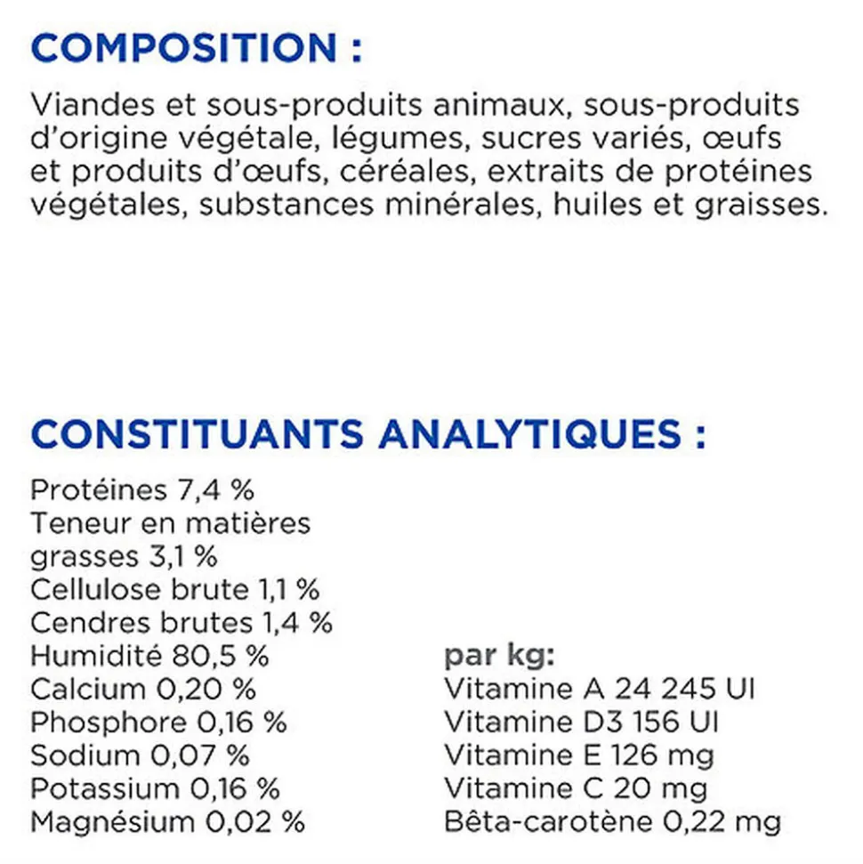 | Composition | Poulet : Foie de poulet, poulet (26 %), porc, amidon de maïs, amidon de tapioca, froment, cellulose, sucres, concentré de protéines végétales, minéraux, protéines animales déshydratées, carottes déshydratées, œuf entier en poudre, huile de tournesol, huile de poisson, vitamines, oligo-éléments et bêta-carotène. Coloré avec du caramel.Au Saumon : Foie de poulet, poulet, saumon (4 %), amidon de maïs, porc, concentré de protéines végétales, amidon de tapioca, cellulose, froment, sucres, minéraux, protéines animales déshydratées, carottes déshydratées, œuf entier en poudre, vitamines, huile de poisson, huile de tournesol, oligo-éléments et bêta-carotène. Coloré avec du caramel.A la Dinde : Poulet, dinde (5 %), porc, amidon de maïs, amidon de tapioca, froment, cellulose, sucres, concentré de protéines de pois, minéraux, carottes déshydratées, œuf entier séché, protéines déshydratées, huile de tournesol, huile de poisson, oligoéléments, taurine et bêta-carotène. Coloré avec du caramel naturel.A la Truite : Poulet, porc, truite (4 %), amidon de maïs, amidon de tapioca, froment, cellulose, concentré de protéines de pois, sucres, minéraux, carottes déshydratées, protéines déshydratées, œuf entier séché, huile de tournesol, oligo-éléments, vitamines, taurine et bêta-carotène. Coloré avec du caramel naturel. |