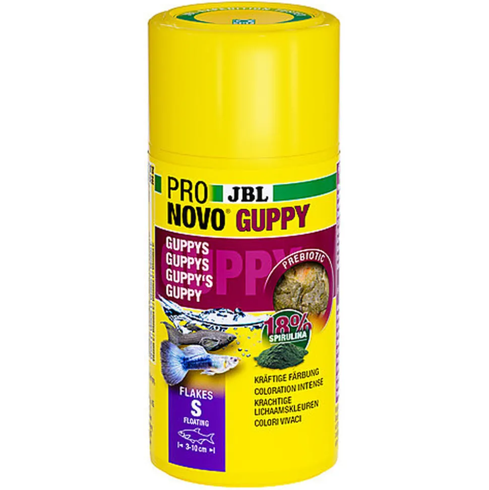 Aliment de base en flocons, taille S, pour guppys et autres poissons ovovivipares de 3 à 10 cm, grande appétence, même chez les characins difficiles, grâce aux ingrédients de qualité : saumon, crevettes et spiruline.