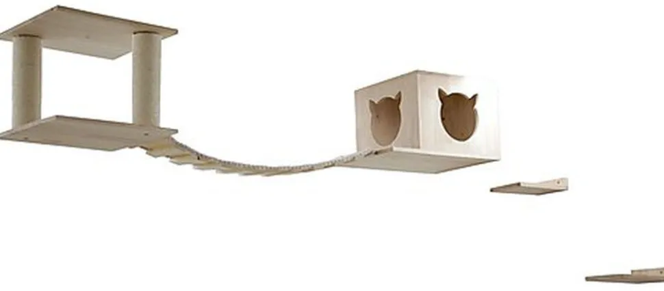 5 pièces, 2 planches : 15 x 22 cm. Igloo avec coussin intérieur : 50 x 38 x 30 cm. Pont suspendu revêtu de sisal : 85 x 20 cm. Surface de couchage avec colonnes et coussin amovible : 40 x 40 x 33 cm. Sans matériel de fixation.
