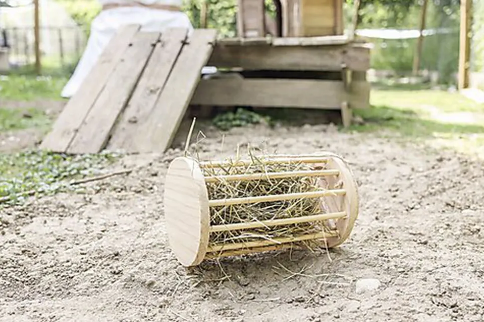 Râtelier à foin 3 en 1 pour un remplissage facile par le haut grâce au couvercle amovible : accrocher, faire rouler et poser.