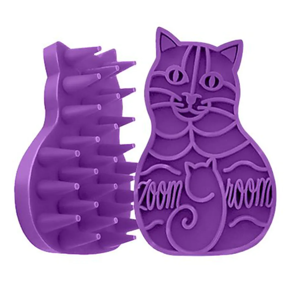 La brosse KONG ZoomGroom® pour chats masse brosse en même temps. Les picots souples en caoutchouc retiennent les poils morts.