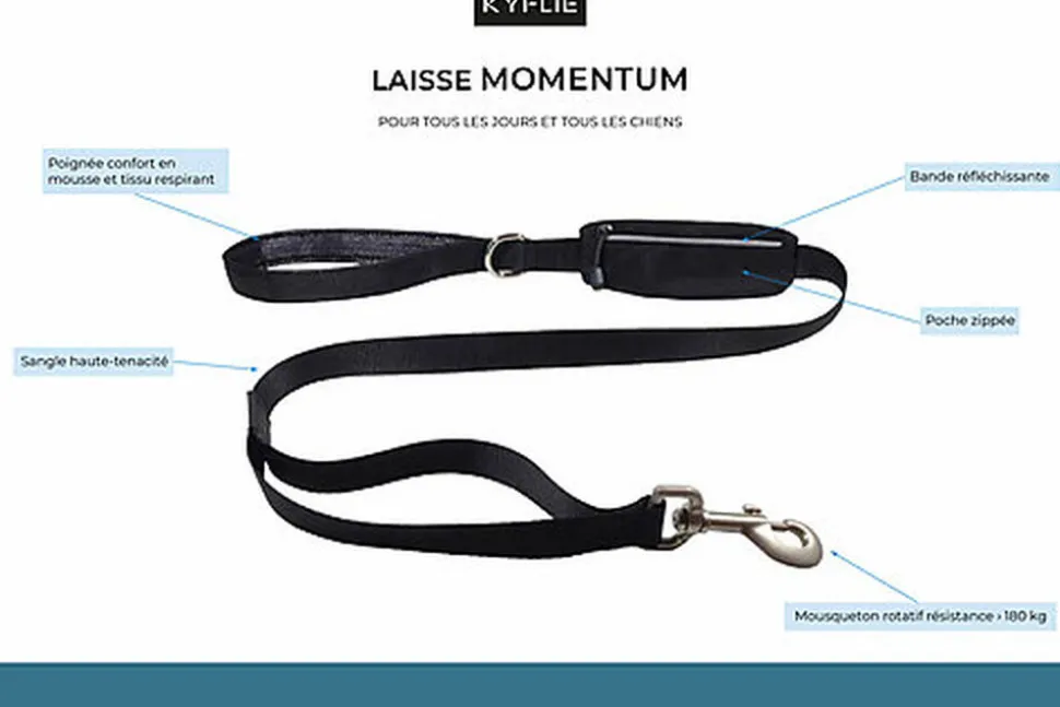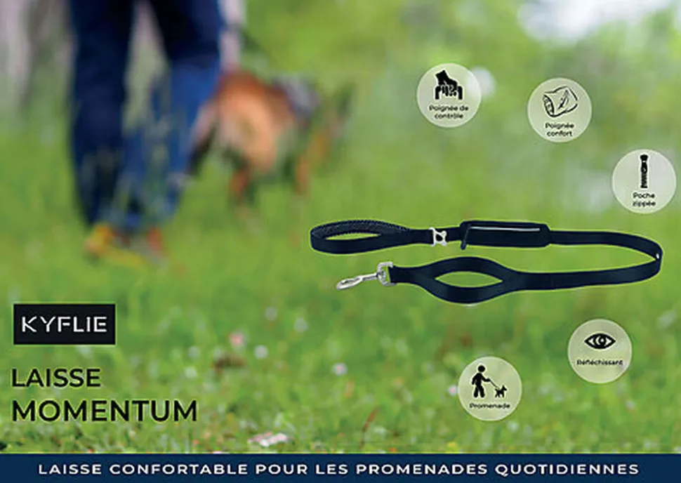 La laisse MOMENTUM de KYFLIE est une laisse de promenade quotidienne pour chien munie de deux poignées, une haute renforcée de mousse confortable et d’un tissu mesh doux et respirant, ainsi qu’une basse pour le contrôle du chien au pied. La poche zippée permet de ranger vos accessoires et d’être vu dans la nuit grâce à sa bande réfléchissante située au niveau du zip. Un anneau métallique léger est utilisable comme point d’attache du mousqueton ou autres accessoires. Le mousqueton à tête rotative et résistant évite que la laisse ne vrille sur elle-même lorsque le chien tourne en rond.