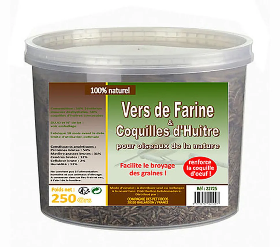 Vers déshydratés et coquilles d’huitres concassées pour poules et poussins.