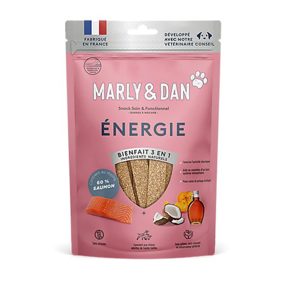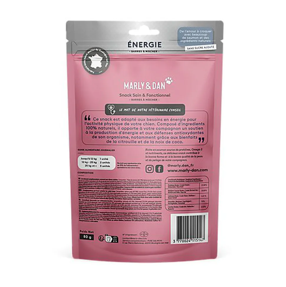 « Ce snack est adapté aux besoins en énergie pour l’activité physique de votre chien. Composé d’ingrédients naturels, il apporte à votre compagnon un soutien à la production d’énergie et aux défenses antioxydantes de son organisme. »
